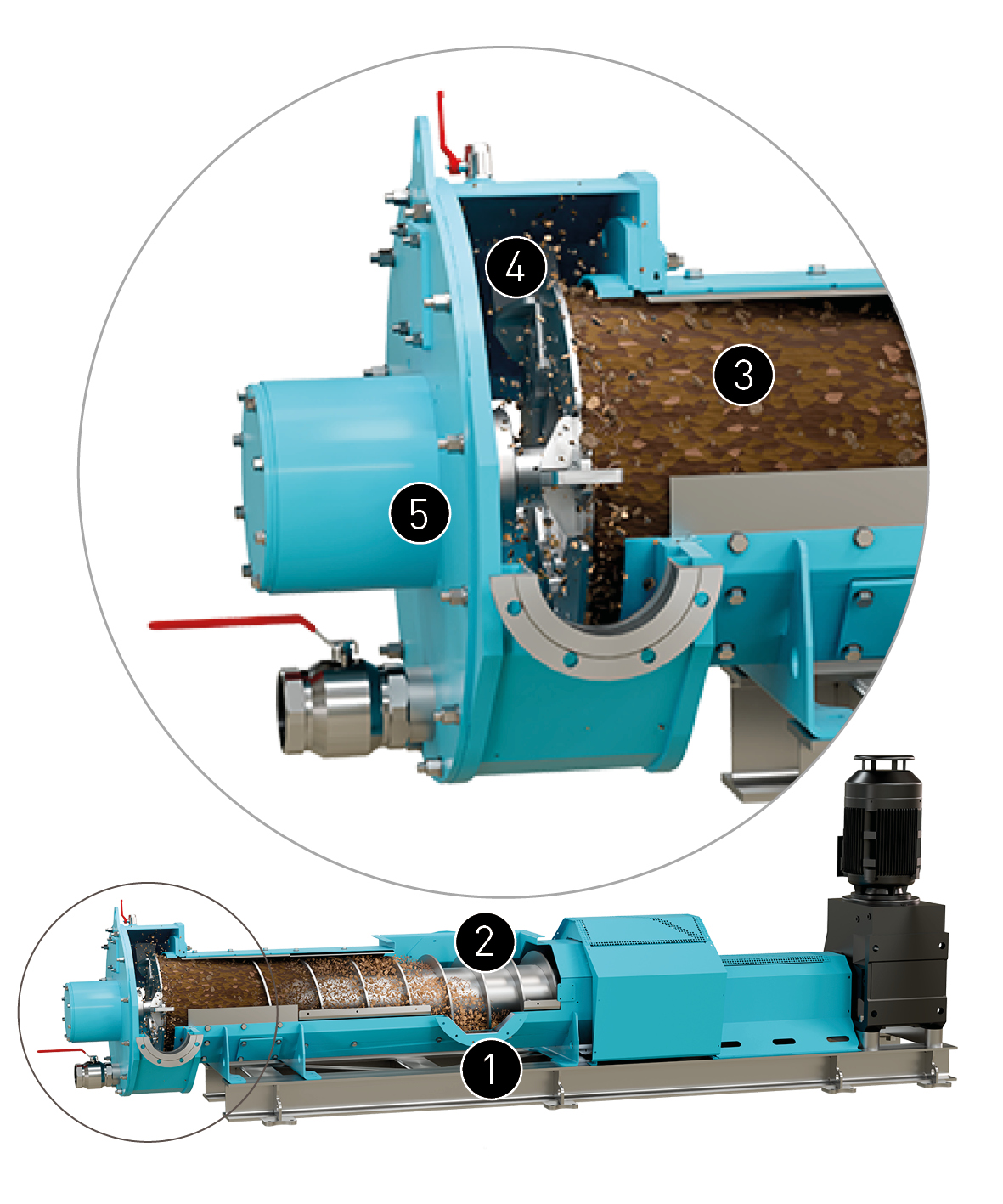Die Multi Disc verschließt den Presskanal sicher, bis sich ein stabiler Biomassepfropfen gebildet hat. Erst dann öffnet sich die Multi Disc – die Biomasse wird kontrolliert in den Rezirkulatstrom eingebracht. Eine intelligente Steuerung überwacht permanent die Verpressung im abdichtenden Pfropfen. Ist dieser aufgrund wechselnder Beschaffenheit der Biomasse nicht mehr ausreichend stabil, verringert die Multi Disc den Eintragsspalt automatisch.